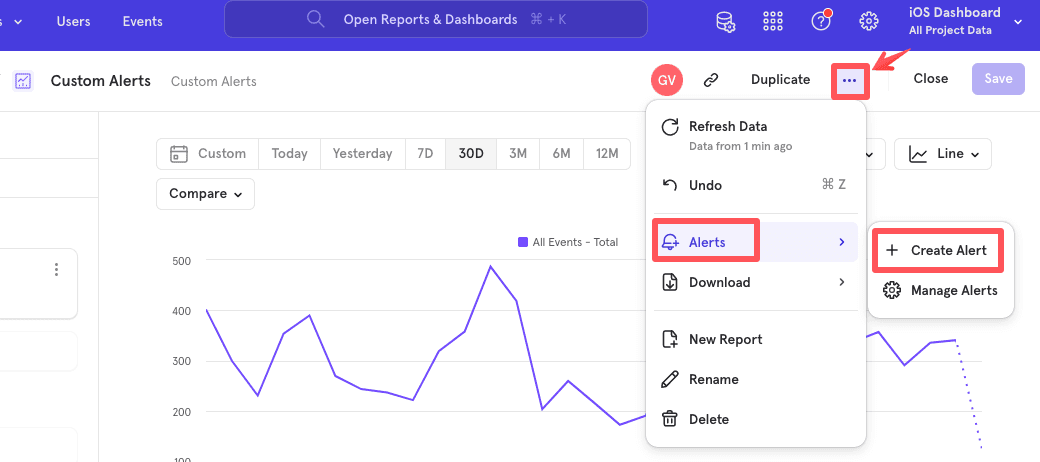- While custom alerts are available on any insights or funnel report, at the moment, anomaly detection alerts are only available on insights reports using a time series visualization.